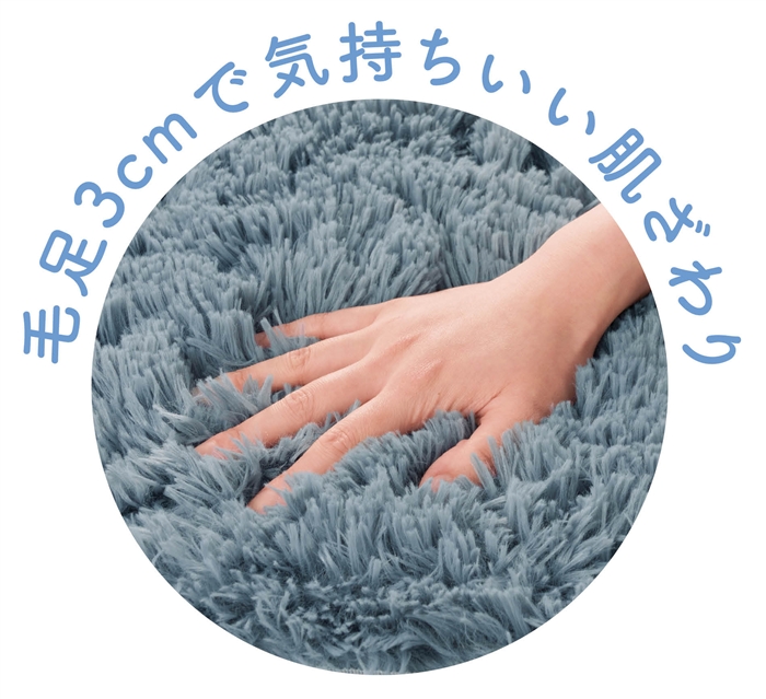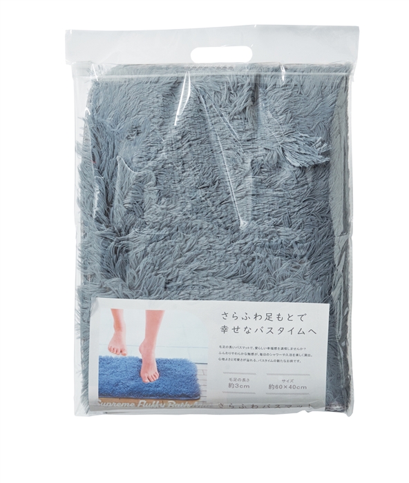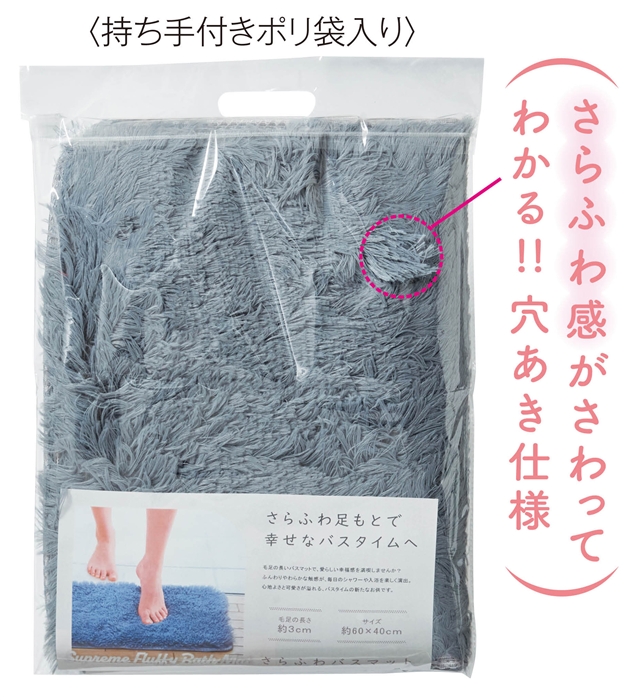 およそ3cmのふわふわな毛足が心地よさを包み込むバスマット。梱包してある状態でも質感を確かめていただけるよう、パッケージの一部が穴あき仕様になっています。裏面にはすべり止めがあり、洗濯ネットに入れて丸洗い可能でお手入れも簡単です。