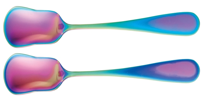 角度によってさまざまな色に見えるステンレス製のデザートスプーンの2本セット。カラフルな見た目で写真映えもバッチリ。イベントの景品やノベルティにおすすめのアイテムです。柄の部分に名入れ&デザインができます。ステンレス製品なのでレーザー刻印もおすすめ。