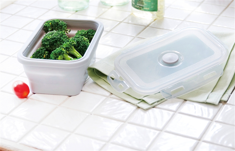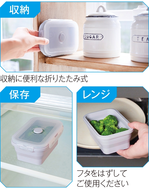 レンジも可能なシリコーン素材の保存容器。フタを閉めたままでも折りたためる空気弁が付いており、食洗機も利用可能。下ごしらえや再加熱にも最適です。たためば約3cmのスリムな形状になり、かさばりやすい保存容器をすっきり収納できます。