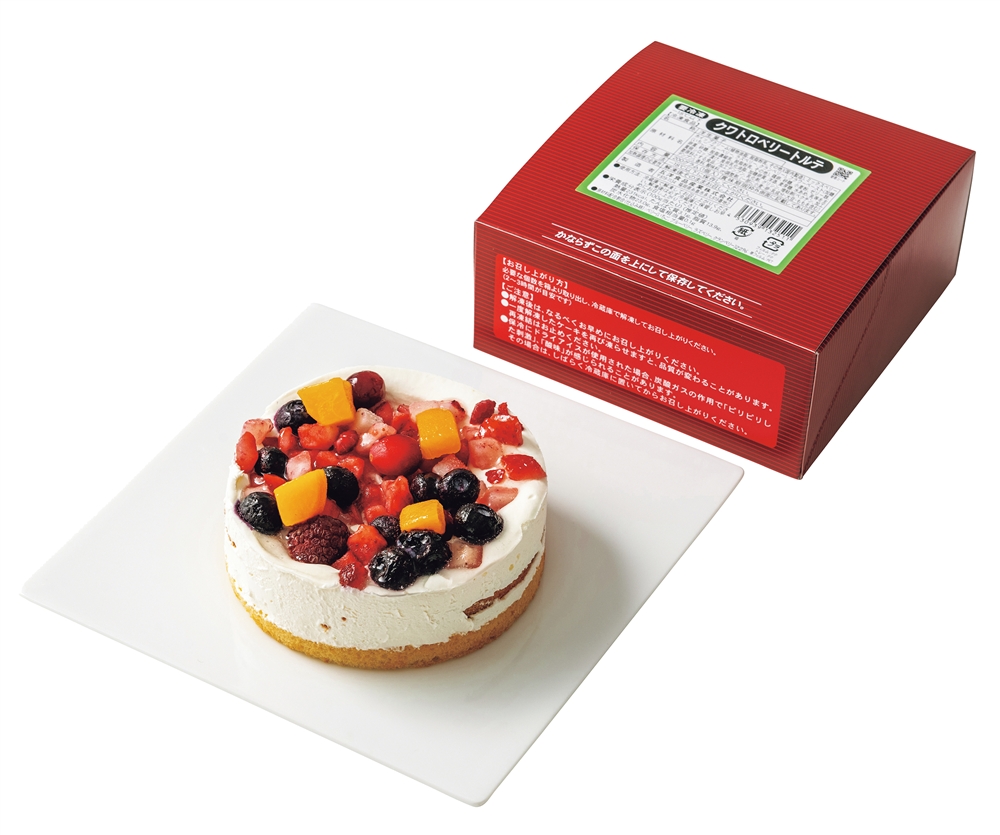 4種のベリーと黄桃をトッピングした華やかなフルーツケーキです。