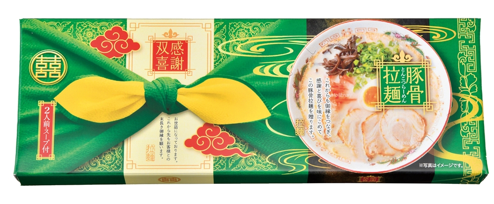 棒ラーメンとして親しまれてきたラーメンは、しっかりとした「コシ」のある麺で、鍋一つでお手軽に煮込みラーメンとしても美味しく頂けます。旨みを凝縮しつつ、あっさりと食べられる豚骨ラーメンです。商品名の「双喜」は双喜紋の 「喜」を2つ重ねて「二重の慶事」という意味です。パッケージにカードを差し込んでありがとうの気持ちを商品にのせて伝えることもできます。
