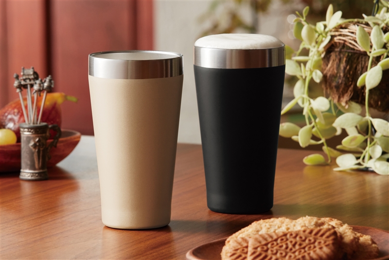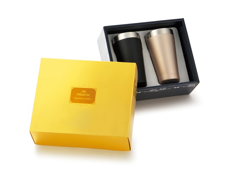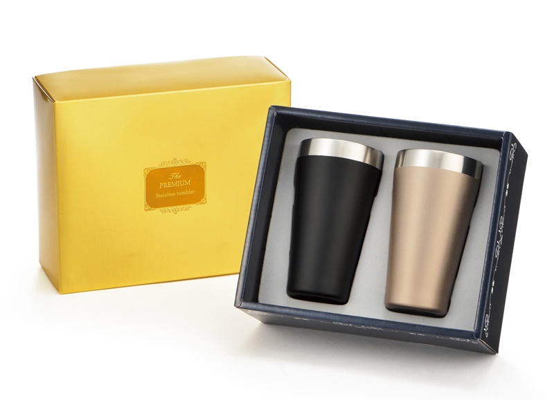 金色でとても目立つ化粧箱に入った真空二重構造のタンブラーギフトです。マットな質感のシャンパンゴールドとブラックの2色は高級感があります。名入れが可能なので、創立・設立記念品などにご利用ください。
