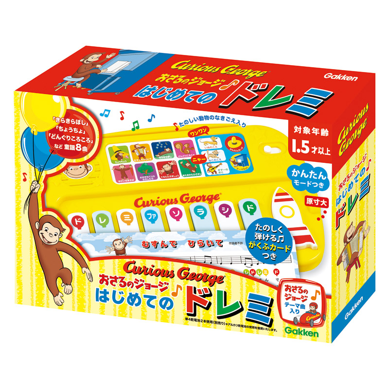 音楽に合わせて、歌ったり手をたたいたり。親子で楽しみながら遊べます。リズム感が身につくことはもちろん、手指を動かして遊ぶことは、お子さまの知能の発達に役立ちます。●楽しい童謡8曲入り(おおきなくりのきのしたで、むすんでひらいて、きらきらぼし、どんぐりころころ、ちょうちょう、ゆかいなまきば、てをたたきましょう、あたまかたひざポン)●ネコとイヌの鳴き声、ギターの音色入り●おさるのジョージテーマ曲入り●楽譜カード4枚入り(8曲分)