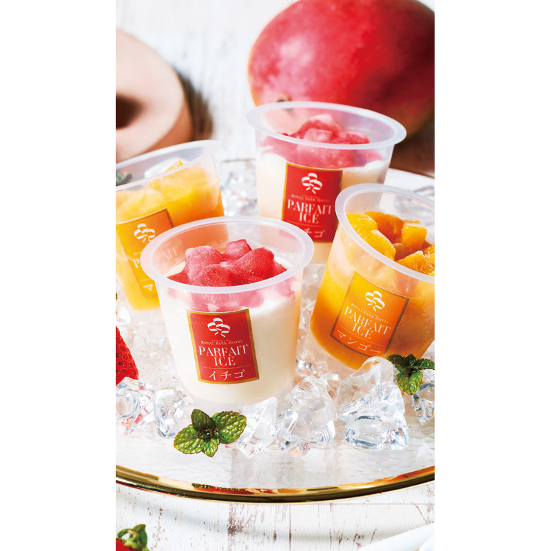ログイン程よい甘さと酸味が特徴のパフェアイス 横浜ロイヤルパークホテル監修のイチゴとマンゴーのパフェアイスセットです。