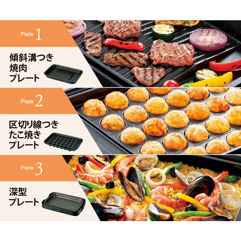 「傾斜溝つき焼肉プレート」「深型プレート」「区切り線つきたこ焼きプレート」の3枚プレートがついています。