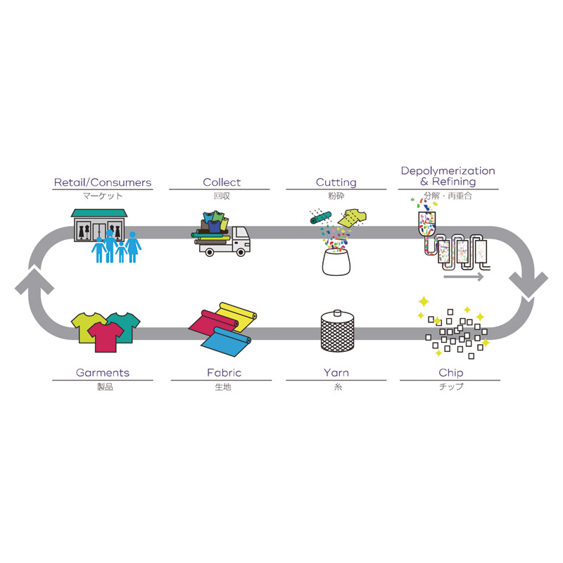 一般的なリサイクルポリエステルでは、選別された使用済みペットボトルを原料とし、溶かして再度糸にする手法を取ります。それに対してこのタオルに使用しているポリエステルは、使い終わった古着や工場での生産時に出た残反(生地)を原料としています。分解・再重合などといった工程を経ることで石油由来のポリエステルと比較してもクオリティが劣らないポリエステルを生産することができます。