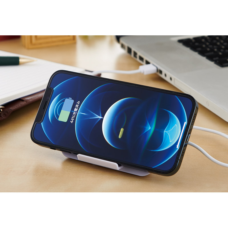 Qi対応のスマートフォンを置くだけで充電できるワイヤレス充電器。スタンド機能付。コンパクト設計で、旅行等でも持ち運びラクラク。
