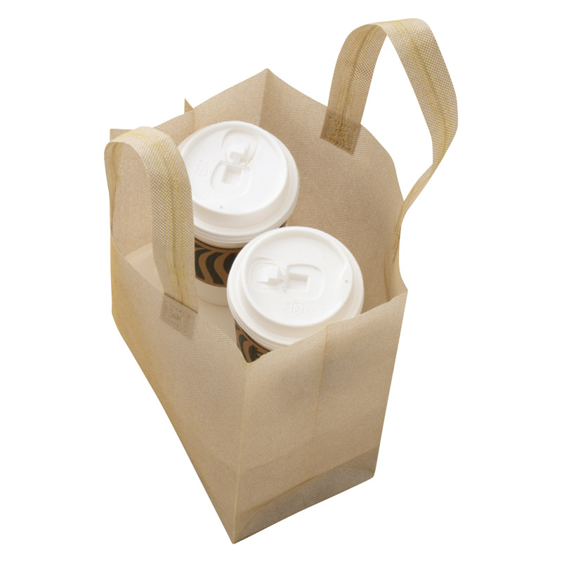 おしゃれなモカ色でマチ付きのスタイリッシュなデザインのRPET不織布バッグ。回収された使用済みペットボトルを原料(100%)として生産された生地で作られています。