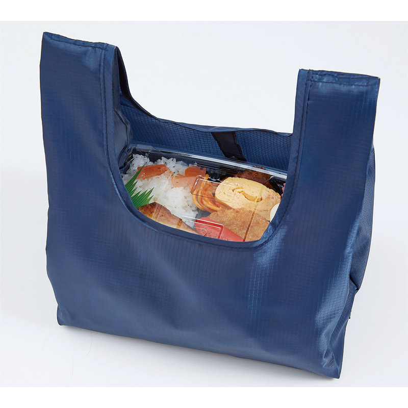 お弁当が傾かず運べる、マチの広い折りたたみトート。テントにも採用される、丈夫でしなやかな生地で、表面には雨や汚れを弾く撥水加工が施されています。ボタン付きストラップでコンパクトに収納できます。フルカラー熱転写対応可能