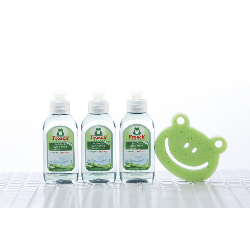 生分解性の高い界面活性剤を使用し、エコでありながら強力な洗浄力を持つ「フロッシュ」は、天然アロエヴェラエキス配合。弱酸性で手肌にも優しい食器用洗剤です。洗浄成分はほぼ100%自然に還ります。