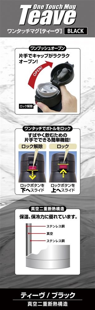 真空二重断熱構造なので保温保冷効力に優れています。 片手でキャップがラクラクオープン!