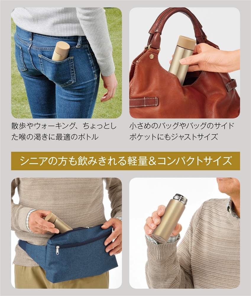 ポケットに忍ばせられるコンパクトサイズで、年配者にも持ち運びしやすくお散歩や通勤に最適。真空二重構造で飲み物の温度を保ち、環境への配慮も大切にし、SDGsの目標14に貢献。企業や施設名を印刷してオリジナル制作も可能。実用性と環境への意識を持つ贈り物としてもおすすめです。