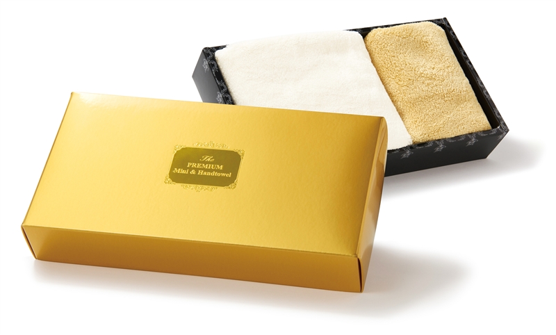 ゴールドに輝くパッケージが目を惹く!外出時に便利な2サイズのタオルを金色に輝くギフト箱に収めました。
