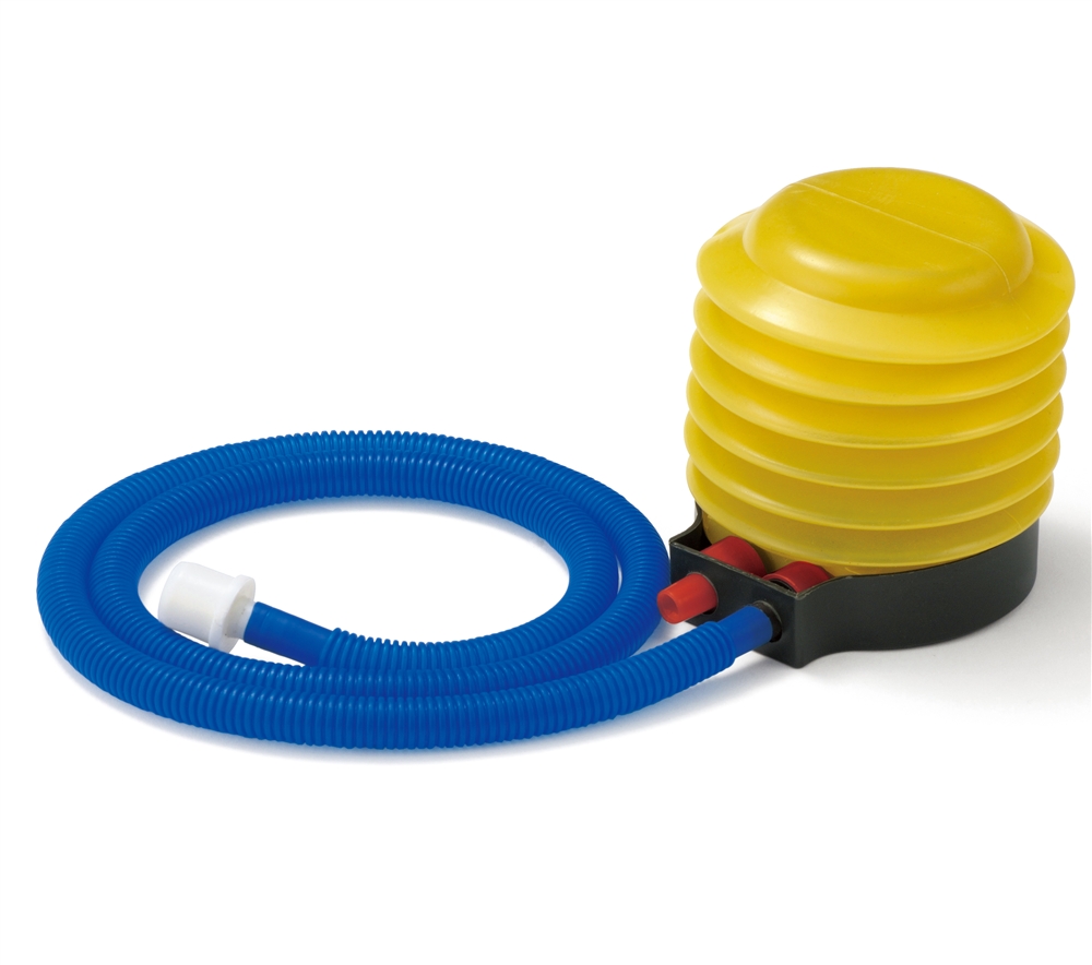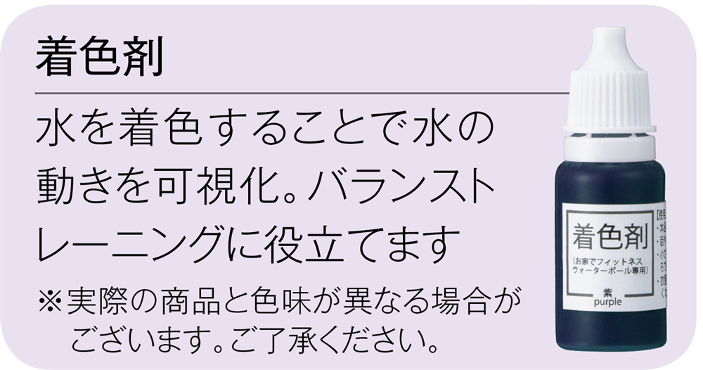 付属の着色剤を使えば、水の動きが可視化されより一層バランストレーニングに役立ちます。本体を膨らませるのに便利な足ふみポンプ付き。