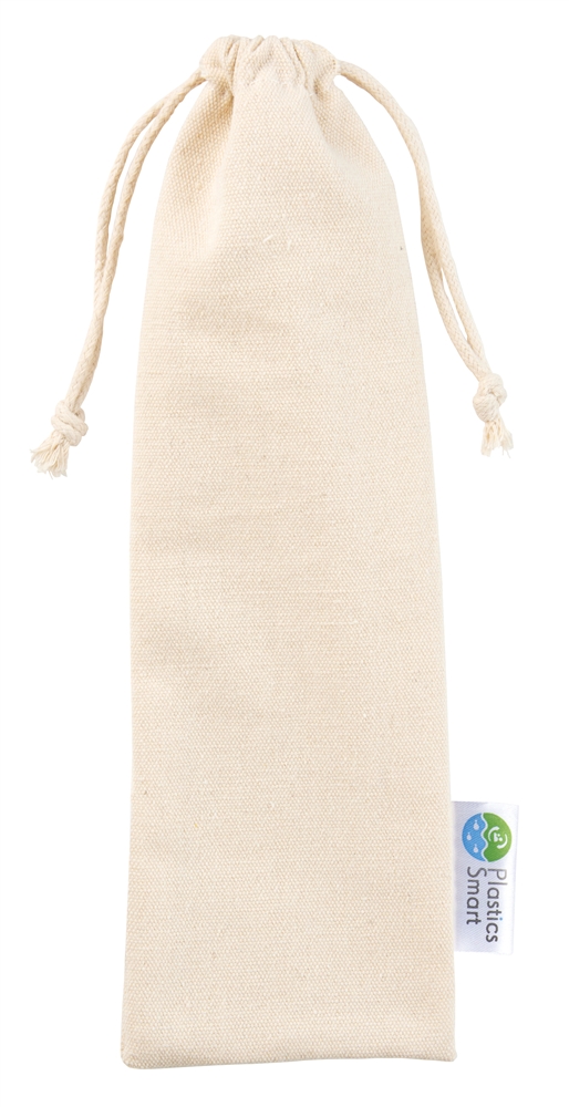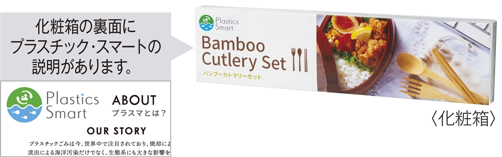 出先で便利な竹製のカトラリーセットをナチュラルなコットン巾着にセットしました。化粧箱の裏面にはプラスチック・スマートの説明入り。
