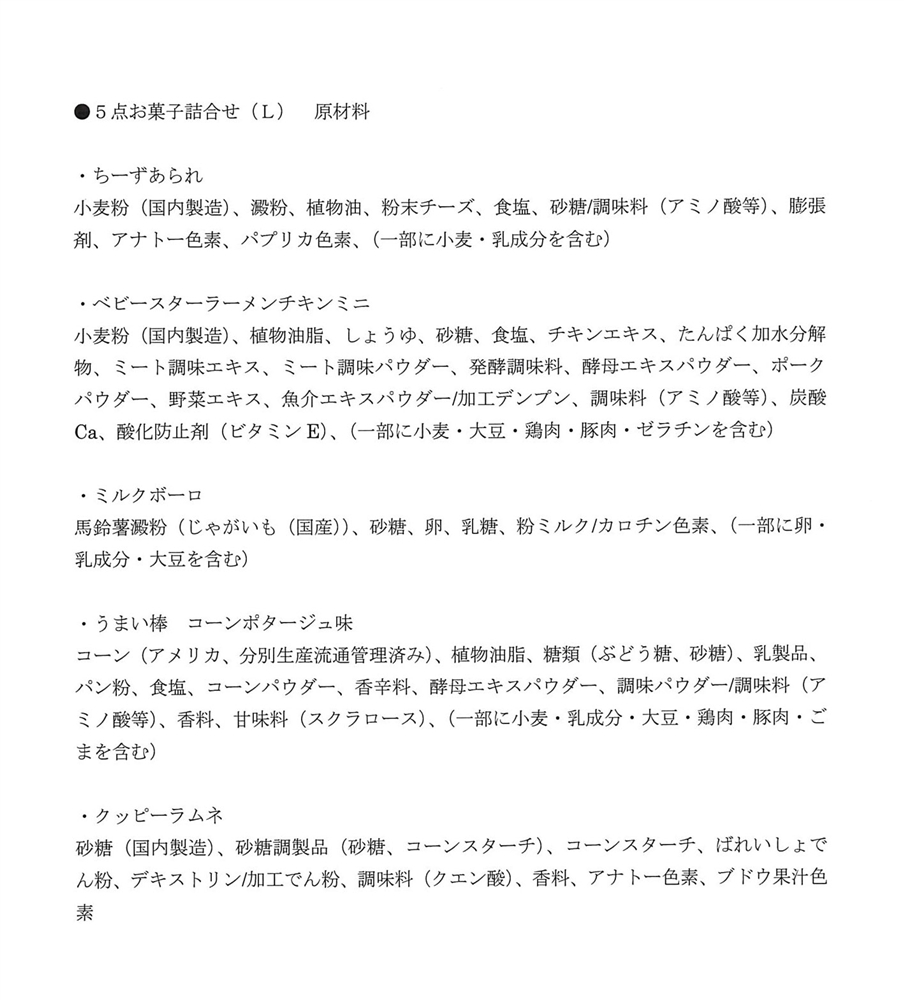 | 備考 | <セット内容> お菓子5個 |