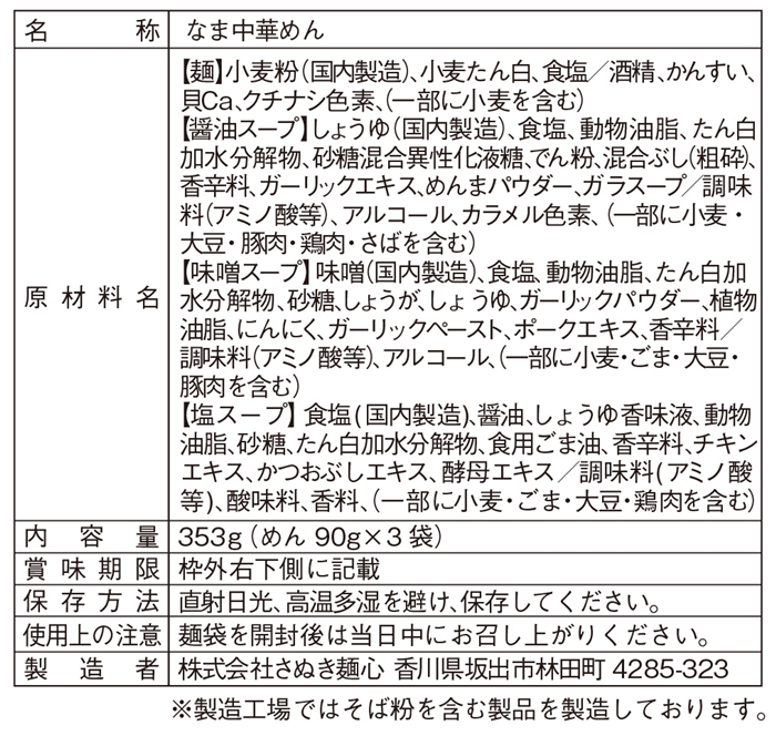 | 備考 | <セット内容> めん90g×3 醤油スープ×1 味噌スープ×1 塩スープ×1 |