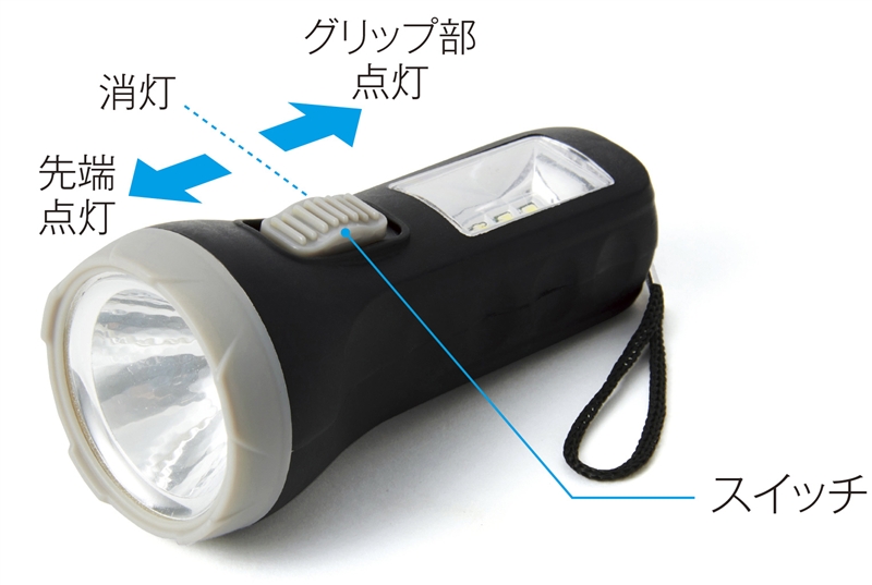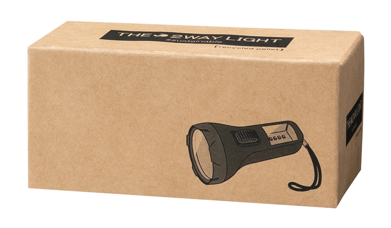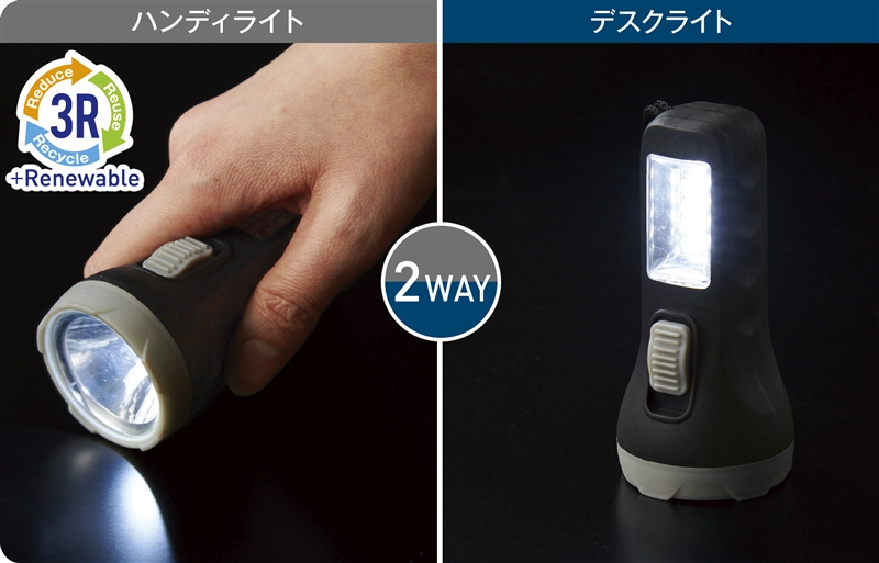 停電など非常時に備えるアイテムとしておススメ!普段使いから非常用まで使える2WAYライトです。先端と側面にライトが付いており、ハンディライトとデスクライトの切り替えは本体のスイッチで簡単に行えます。クラフトパッケージには「3R」を促す「Re-Style」の説明入り。