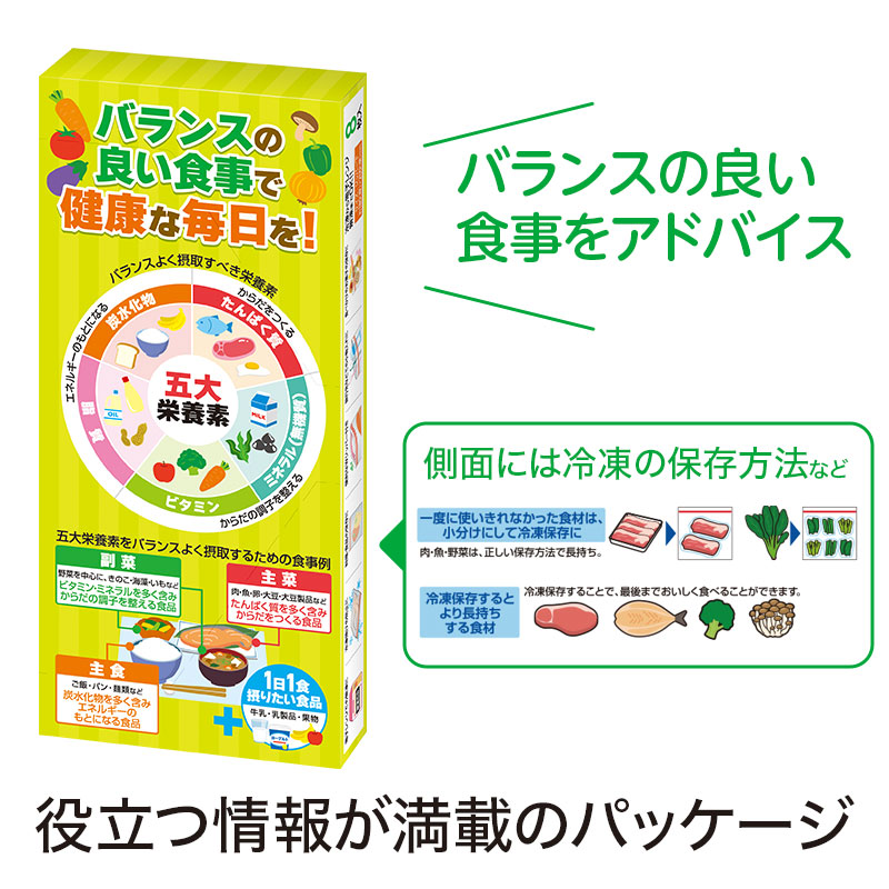 健康な毎日のために。バランス良い食事の取り方をパッケージで解説しています