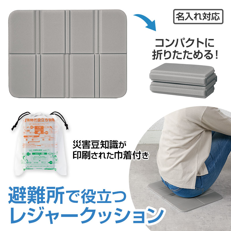 ログイン底冷えするであろう避難所で、マットや枕として役立つレジャークッション。付属の巾着には役立つ情報をプリントしました
