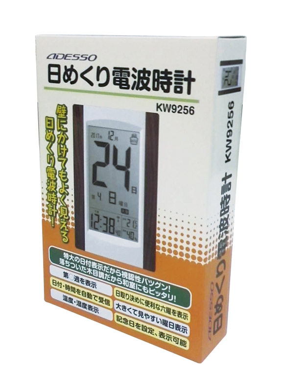 めくり忘れのないデジタルの日めくり時計。日付・温湿度・六曜・第何曜表示、アラーム・スヌーズ機能付き。設定いらずの電波時計です。