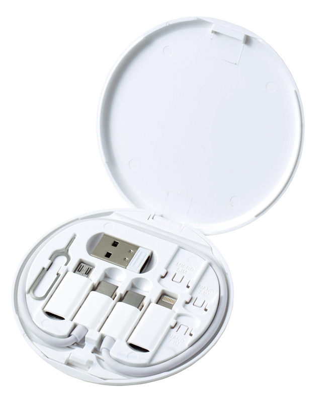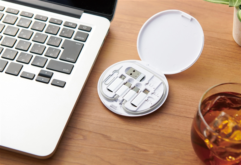 USB Type-Cケーブル、USB Type-Aコネクタ、microUSBコネクタ、Lightningコネクタ、SIM取り出しピンが含まれており、さまざまなデバイスに接続可能です。さらに、ケースを裏返せばスマホスタンドにも。携帯しやすく非常に便利です。フルカラーでの名入れ印刷にも対応しています。
