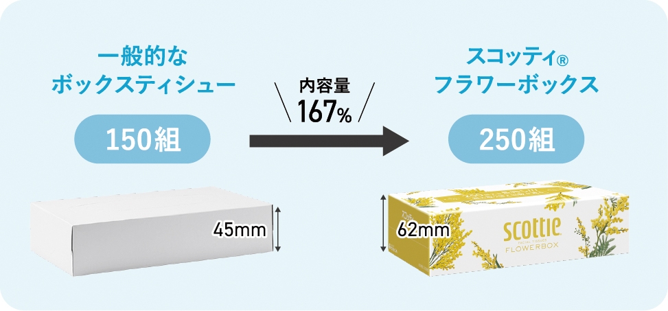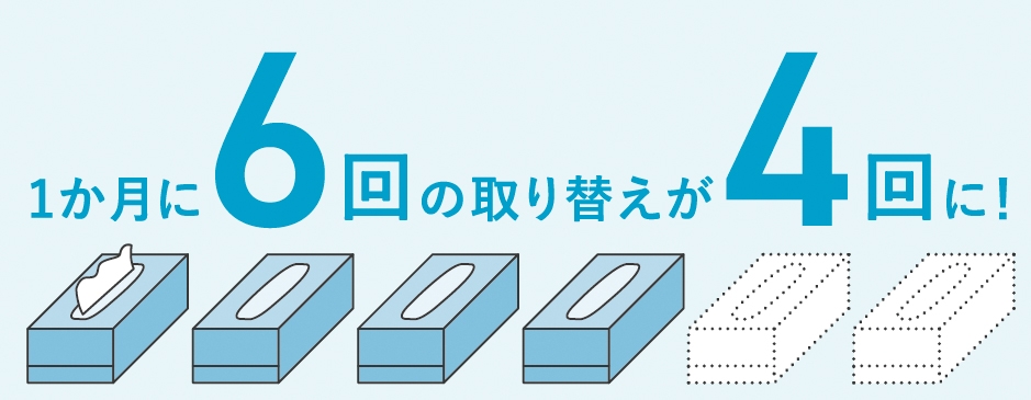 お肌からワイパー使いまで、日常のあらゆるシーンで使えるスタンダード品質。1箱250組入りで長持ちだから、取り替え回数が減らせます。1パックが3箱入りでコンパクトなのに、長持ちのティシュー。つながるサスティナブルで環境課題に貢献。災害時の備蓄にも適しています。