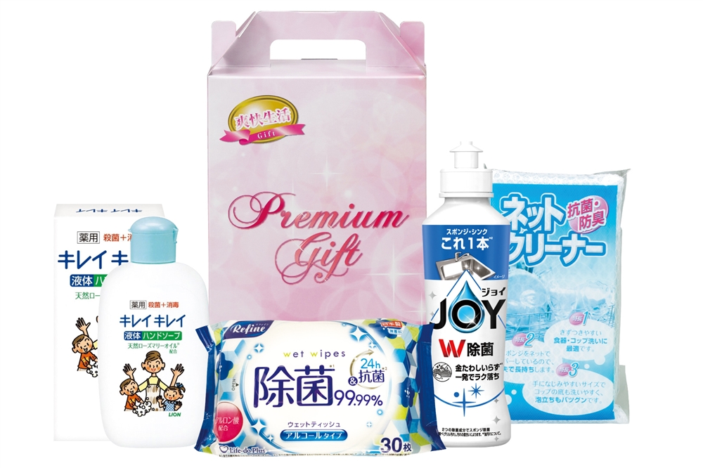 | 備考 | <セット内容> ・ライオン キレイキレイ薬用液体ハンドソープ120ml(箱入)×1 ・P&G除菌ジョイコンパクト170ml(さわやか微香)×1 ・リファイン アルコール除菌ウェットティッシュ30枚×1 ・ネットクリーナー×1 |