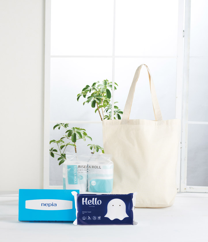 | 注意事項 | セット内容/コットントートバッグ・リセラトイレット2ロール・ネピアBOXティッシュ150W・ハローキッチンペーパー70枚入 |