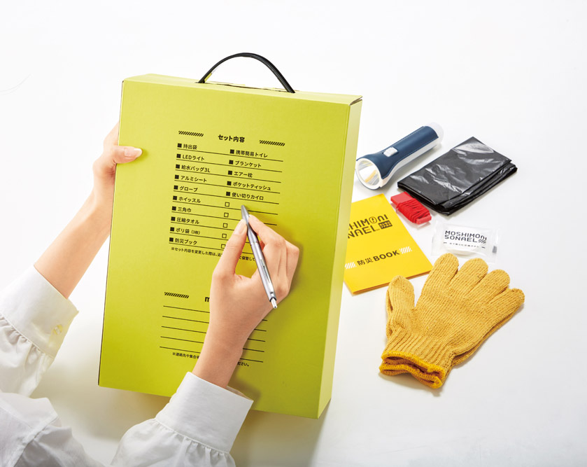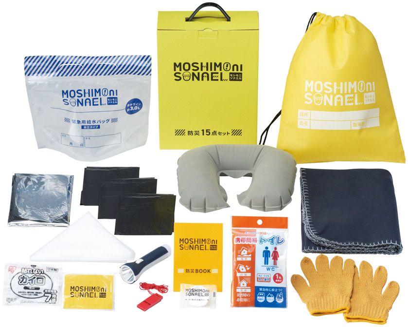| 注意事項 | セット内容/持出袋・給水バッグ3L・LEDライト・ホイッスル・アルミシート(1200×800mm)・グローブ・圧縮タオル(240×400mm)・三角巾・ポリ袋×3・防災ブック・携帯簡易トイレ・ブランケット(600×900mm)・エアー枕・使いきりカイロ・ポケットティッシュ、ライト/単三乾電池1本使用(別途) |