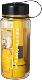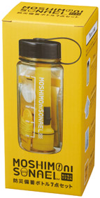 注意事項 | セット内容/ボトル・圧縮タオル(200×200mm)・アルミシート(1400×700mm)・LEDライト・レインポンチョ・ホイッスル・防災ブック、ボトル容量/630ml、ライト/単三乾電池2本使用(別途) |