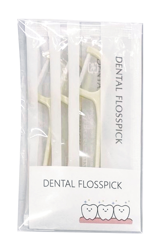 デンタルフロス3本を台紙にセット。アメニティや飲食を伴うイベントのノベルティに。