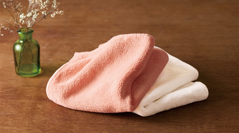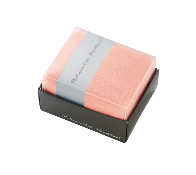 本体カラーはホワイトとピンクの二種類で、心地よい肌触りで毎日使いたくなるハンドタオルです。高級感のある化粧箱入りで、特別なお客様への贈答品やキャンペーン特典としても最適です。