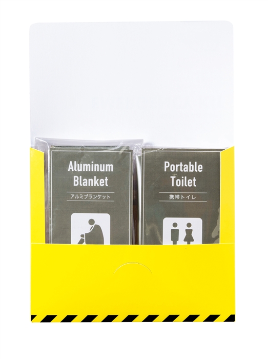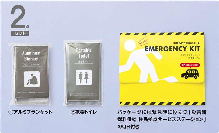 渋滞や非常時に備えて車に常備できる薄型パッケージ入りの携帯トイレとアルミブランケットの防災キット。