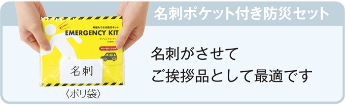 車に置くことを考えた専用の防災セットです。渋滞や事故などによる長時間車内に閉じ込められた際や事故や災害等で車から出られない時を想定したセットです。パッケージには名刺がさせてご挨拶品としてご利用いただけます。裏面には緊急時に役立つ「災害時燃料供給 住民拠点サービスステーション」のQRコード付き。