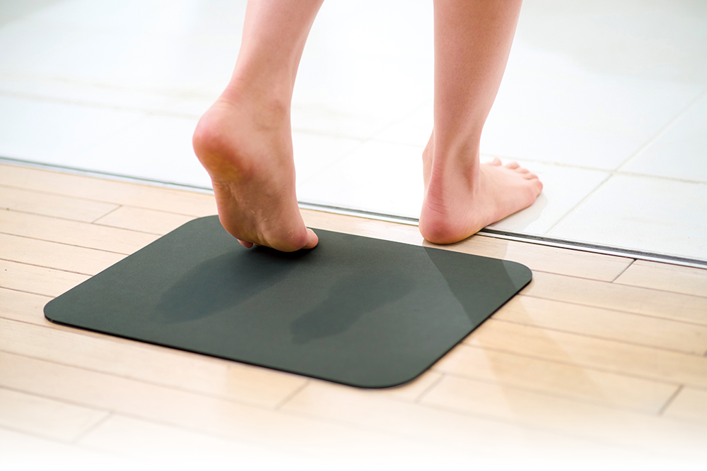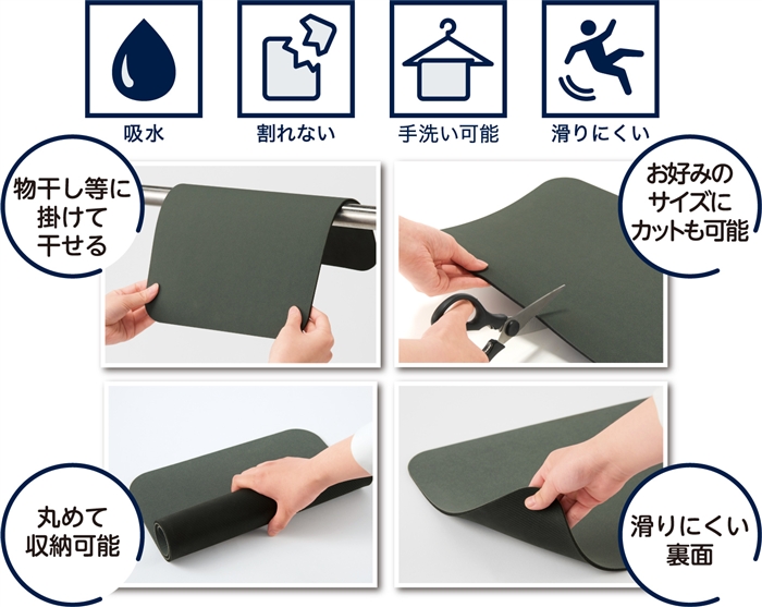 珪藻土パウダーを使用した、吸水の良いマット。これまでの珪藻土バスマットとは違って割れる心配がなく、手洗いもできていつでも気持ちよく使えます。冬でも足元がひんやりせず裏面は滑りにくい加工で、廃棄時にはハサミで小さくカットすることもできます。