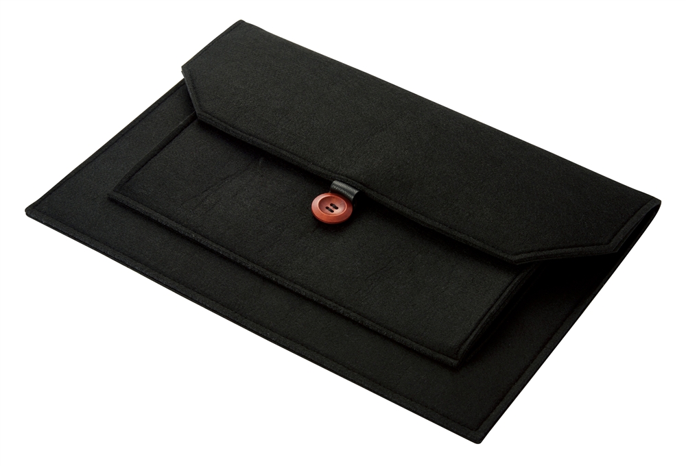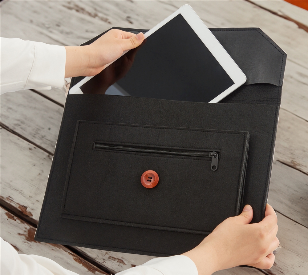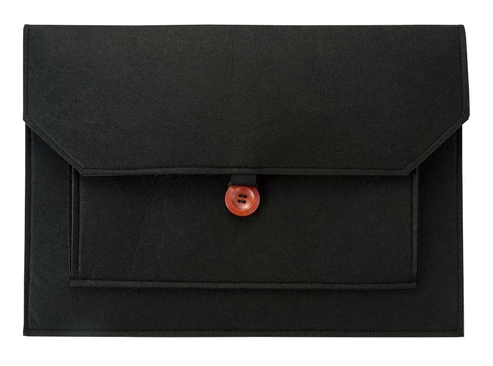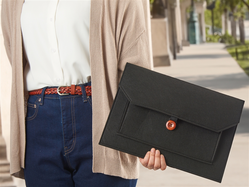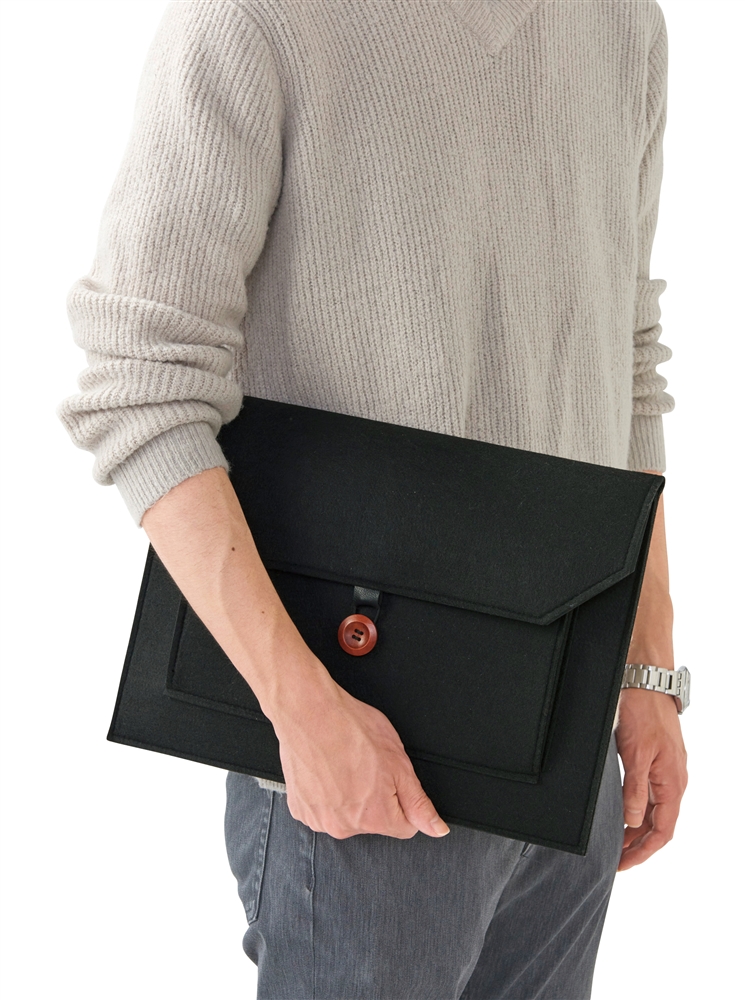ビジネスバッグのインナーバッグとしても使いやすいスマートなシルエット。中央のウッドボタンがアクセントになっています。名入れも可能なので、企業の記念品や従業員向けの備品などで活用できます。