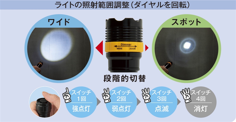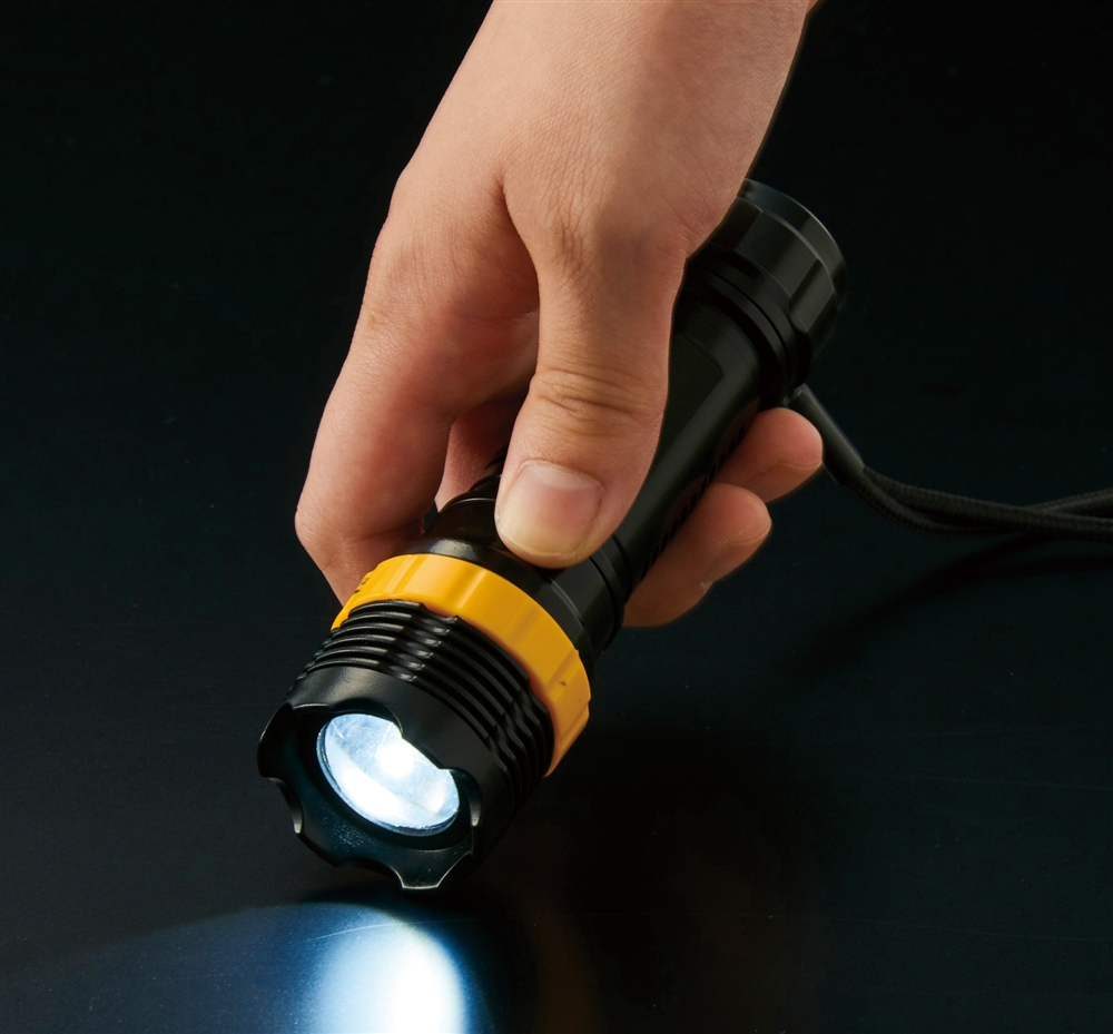スイッチ1回で強点灯/2回で弱点灯/3回で点滅。オレンジ色のダイヤルを回して照射範囲を調整も可能。付属のネックストラップで首にかけられるので、両手が空くのも便利です。アウトドアはもちろん、もしもの備えとしてもおすすめしたいアイテムです。