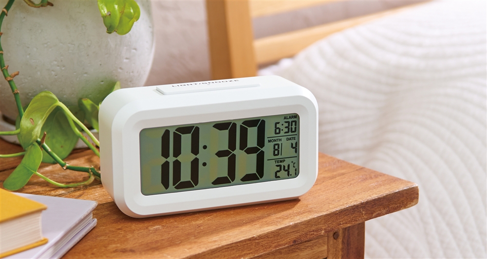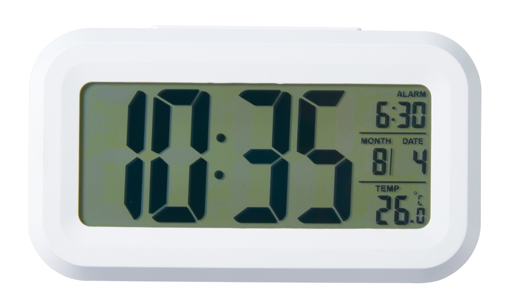 大きな画面ではっきり見やすいデジタル表示の置き時計。