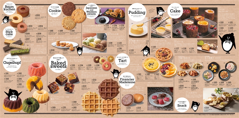 全50品の中からお好きなスイーツをチョイスできます。 「PECK(ペック)=ついばむ」。チョイスカタログ「PECK」は、たくさんのスイーツの中から自分の好きなモノを少しずつチョイスできることから、「鳥がついばむように選べる」をテーマに生まれました。