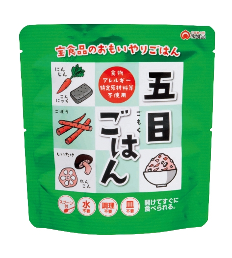 ニンジン、ごぼう、れんこん、椎茸とこんにゃくを加え、昆布やかつおの出汁、魚醤等の旨味をいかした旨味たっぷりの五目ごはんです。香川県産だいしもち(大麦)と国産発芽玄米を使用。スプーンが個別に添付されており、開封してすぐに食べられるごはんです。火や水が使えない状況下でも食べられますが、湯せん等で温めても美味しくお召し上がりいただけます。また食物アレルギー特定原材料等 不使用です。