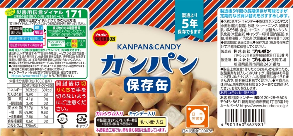製造より5年間、香ばしいおいしさが楽しめます。コンパクトな金属缶を使用し、フタは簡単に開封できるプルトップ式で、便利なキャップ付きにしました。開封後も湿気にくく衛生的に食べられます。日本災害食認証商品です。