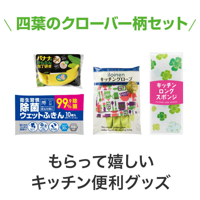 | 注意事項 | ■内容:ハーバルフレッシュコンパクト(グリーンライム) 250ml・キッチンロングスポンジ・バナナでかんたん包丁研ぎ・衛生習慣除菌ウェットふきん(10枚入)・キッチングローブ 各1 |