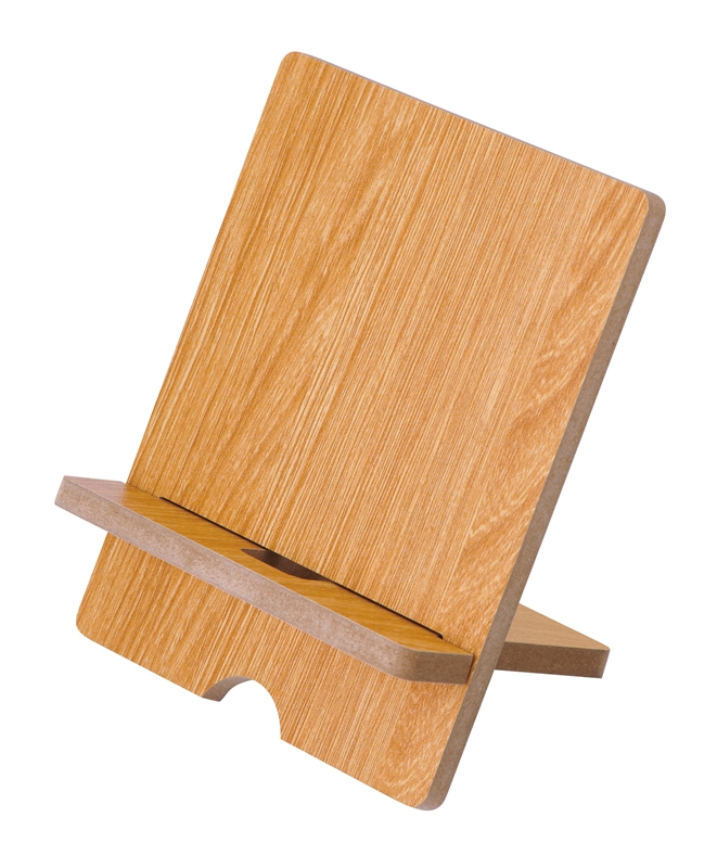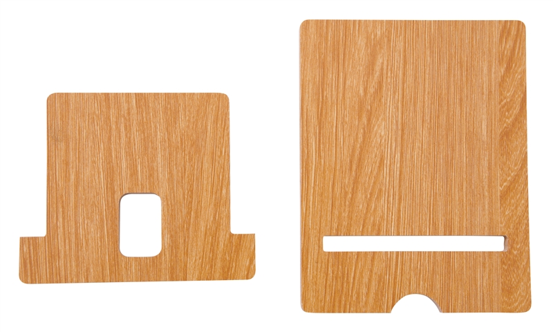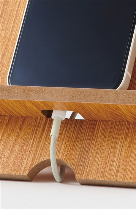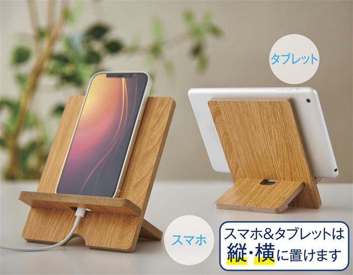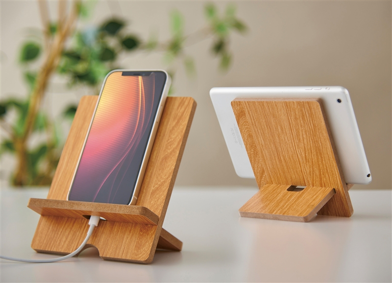 部屋になじむ木目調デザインで、2枚の板を組み合わせる組み立て式。スマホやタブレットを縦・横どちらの向きでも置けるため、動画視聴やオンライン会議に便利。ケーブル用の穴があり充電しながら使用可能。名入れ印刷が可能でモバイルショップや家電量販店のキャンペーン特典、説明会などの記念品としても喜ばれます。