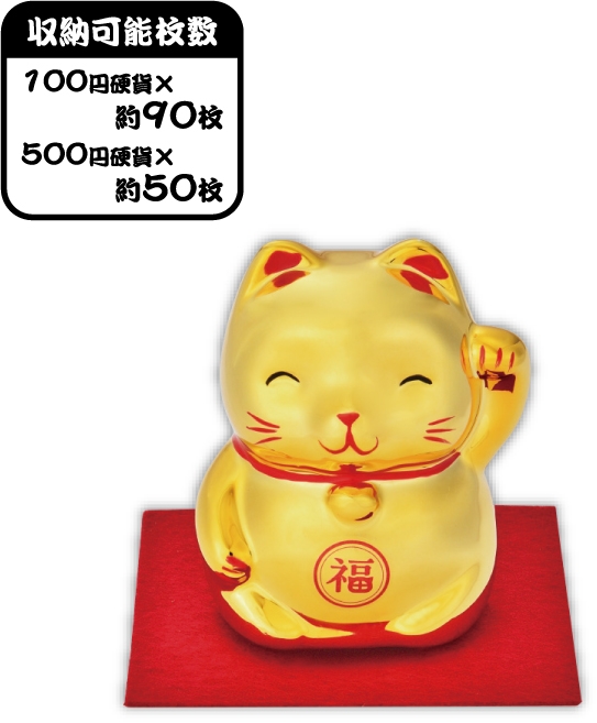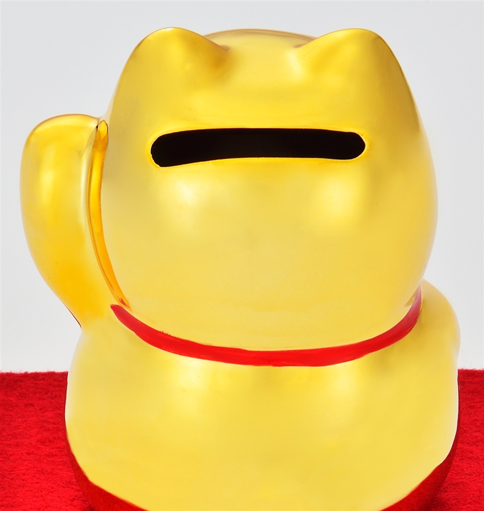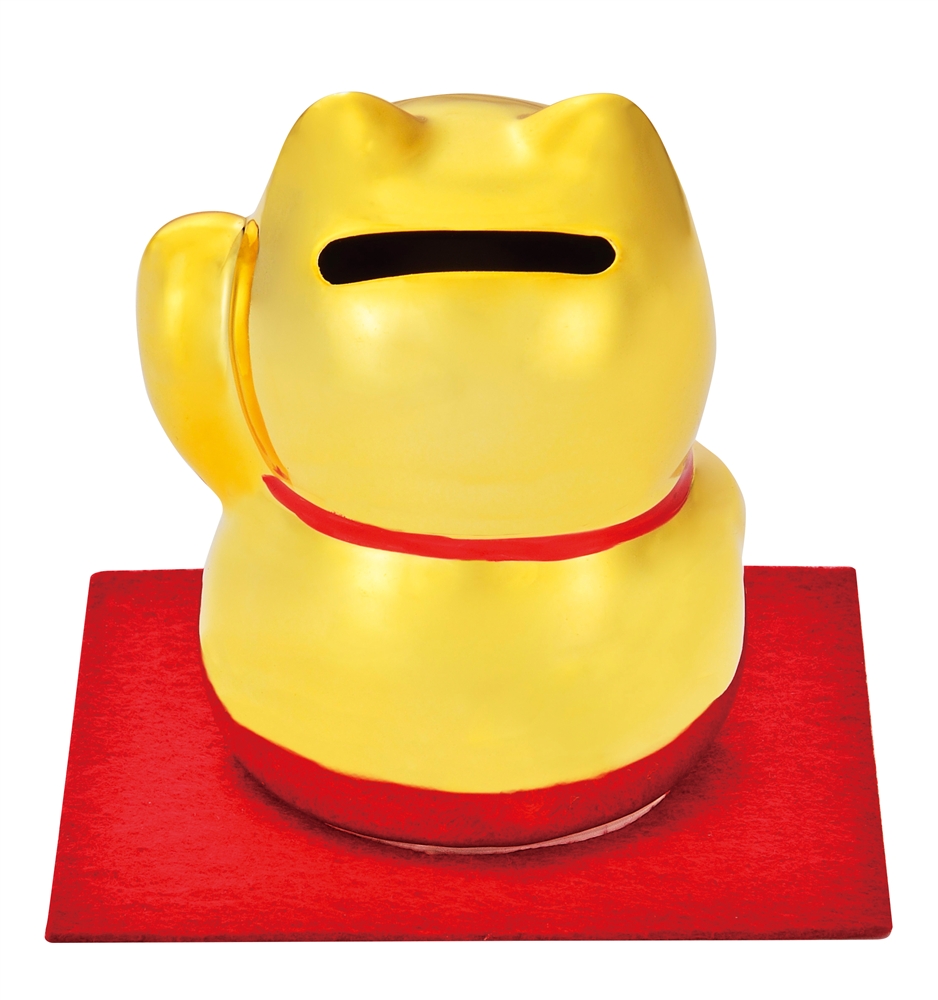 ご縁を招く左手上げの招き猫の貯金箱。金運も招いてくれそうな輝く金色!