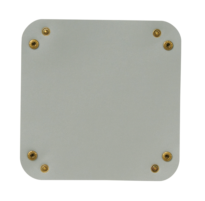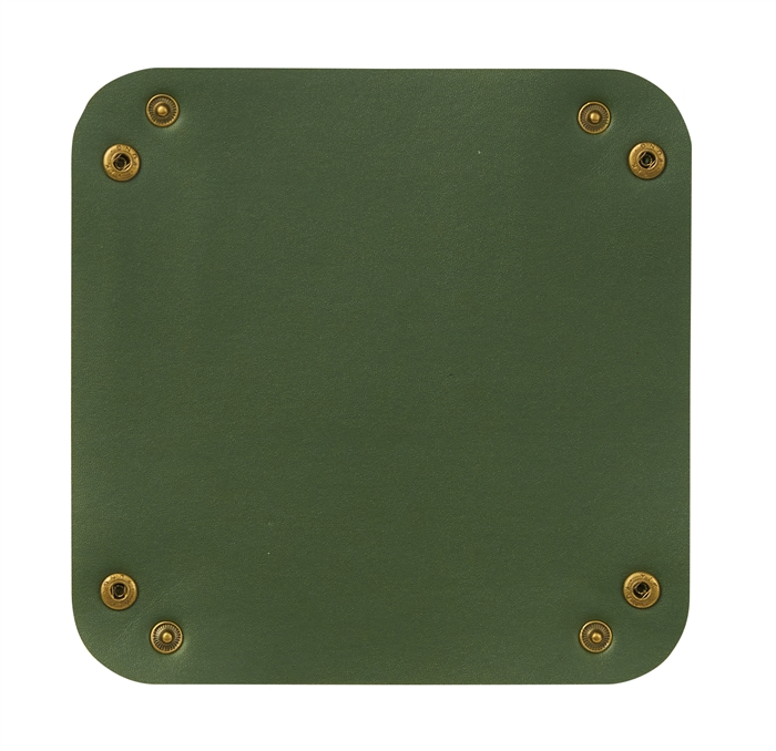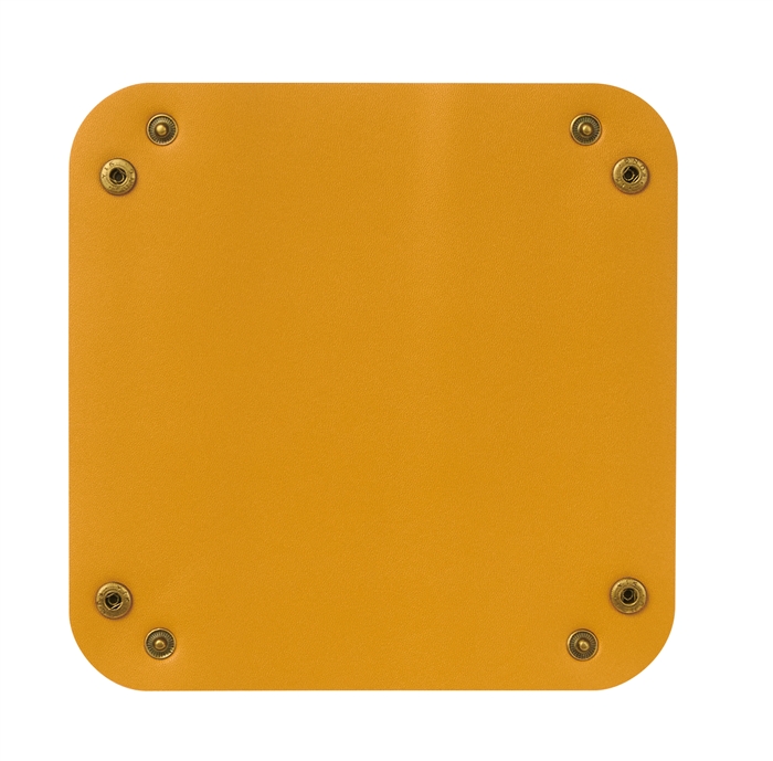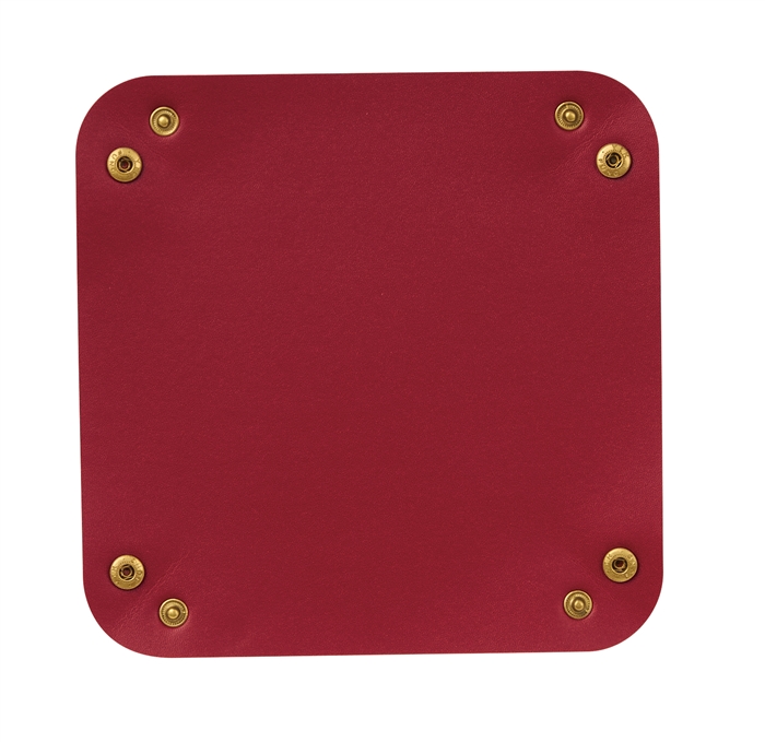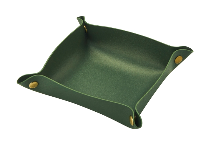 アンティークゴールドのボタンがアクセントのレザー調オーサムトレーは、小物入れとして鍵や腕時計の収納に最適なアイテムです。納品時はフラットな状態なのでかさばりません。名入れ印刷や型押し加工にも対応しており、実用性とデザイン性を兼ね備えたトレーです。周年記念品や卒業記念品などに活躍するアイテムです。