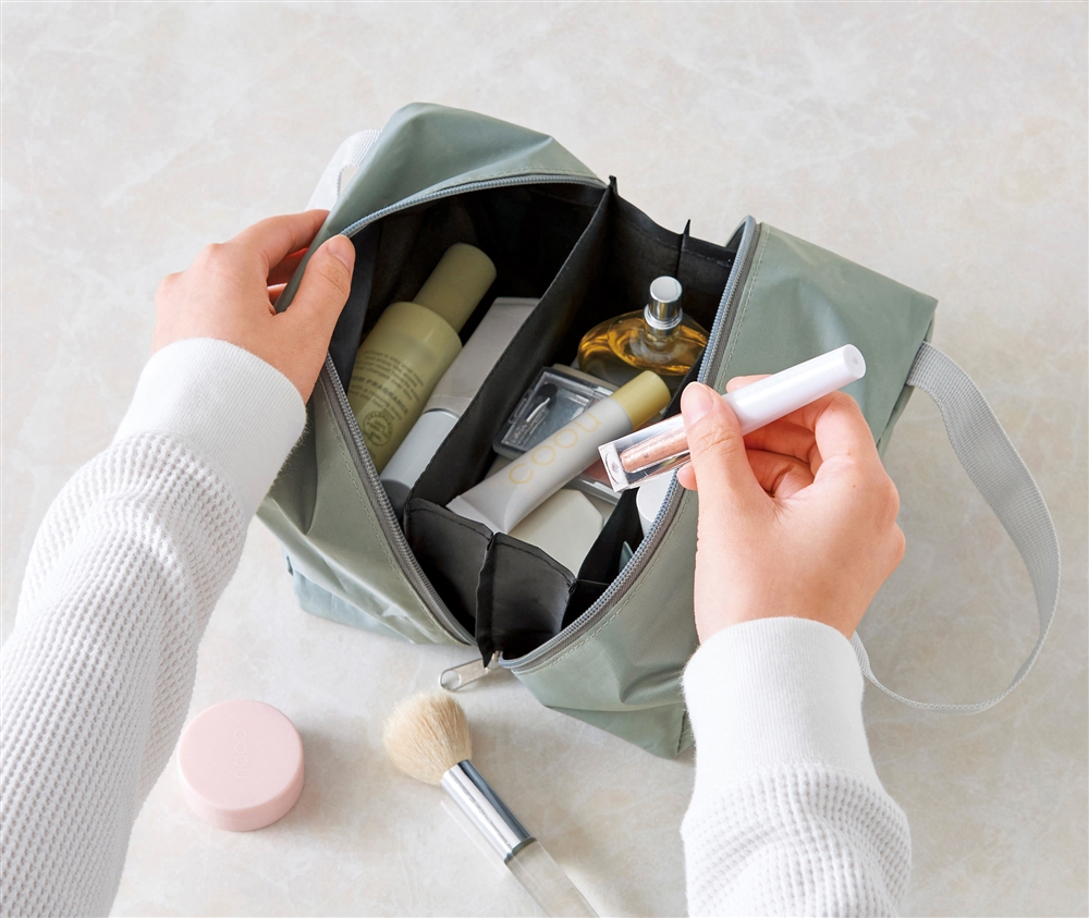 ガバッと開いてポーチの中身が一目瞭然!ハンドルが付いており、持ち運びもラクラク。