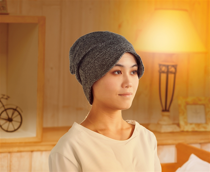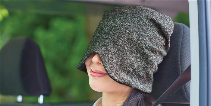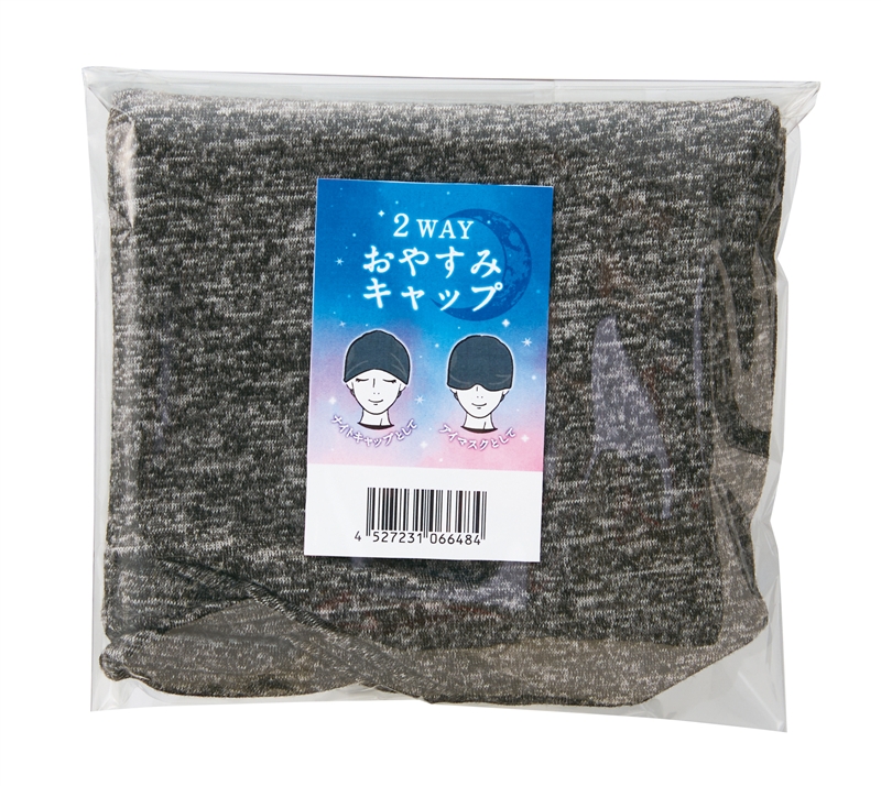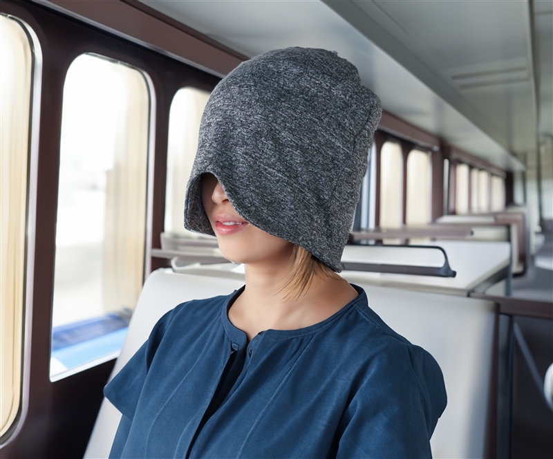 アイマスクとナイトキャップが1つで使えるリラックスアイテム。旅行の移動時などに最適です。