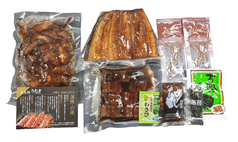 | 備考 | <セット内容> 浜名湖産うなぎ蒲焼80g×1、浜名湖産刻みうなぎ(タレ込)60g×1、浜名湖産うなぎ肝の蒲焼100g×1、タレ・山椒×各1、刻み海苔×1、わさび×1、ダシ×1、吸物×1 |