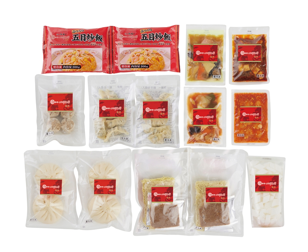 | 備考 | <セット内容> 乾焼蝦仁(エビチリソース)150g、四川麻婆豆腐150g、ふっくら五目炒飯(200g×2)、酢豚150g・杏仁豆腐500g・本格八宝菜150g・小籠包140g(4個入)×各1、餃子120g(6個入)・手包み肉まん240g(2個入)・担々麺セット326g(麺200g、ごまだれ38g、液体スープ58g、ザージャン(肉みそ)30g入)×各2 |